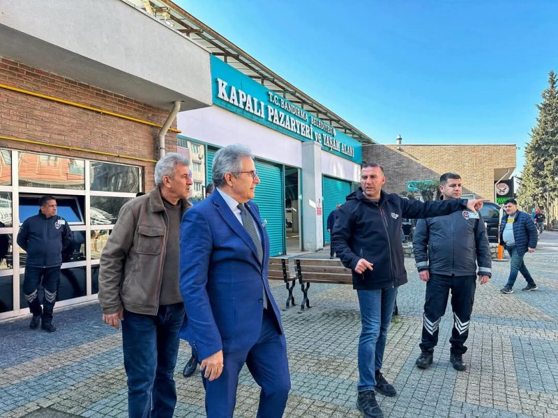 Bandırma Belediye Başkanı Dursun Mirza, ilçedeki Kapalı Pazaryeri’nde incelemelerde bulunarak esnaf ve vatandaşlarla bir araya geldi. Pazar alanında yapılan düzenlemeleri yerinde değerlendiren Başkan Mirza, esnafın taleplerini dinleyerek çözüm önerileri üzerine görüş alışverişinde bulundu.