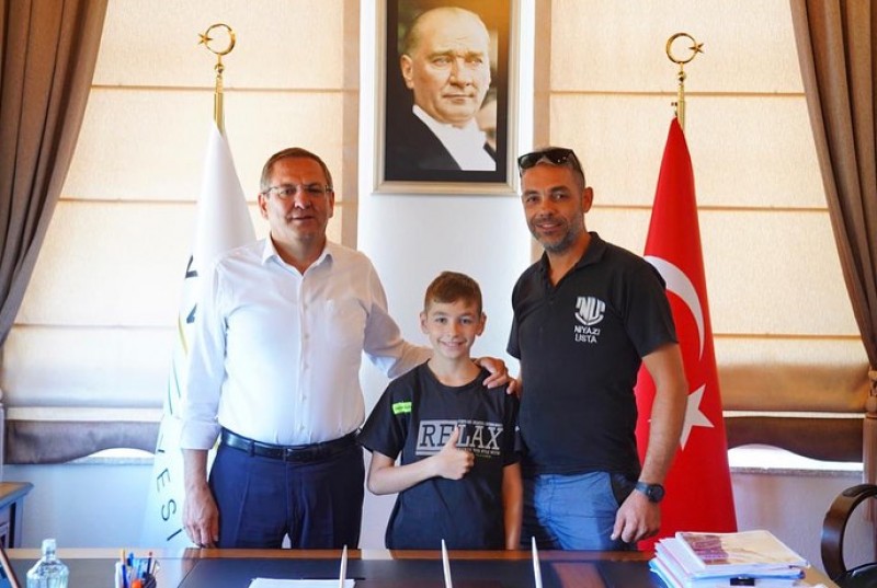 Ayvalık Belediye Başkanı Mesut Ergin, motosiklet sporcusu Çağatay Çoklar'ı ağırladı.
