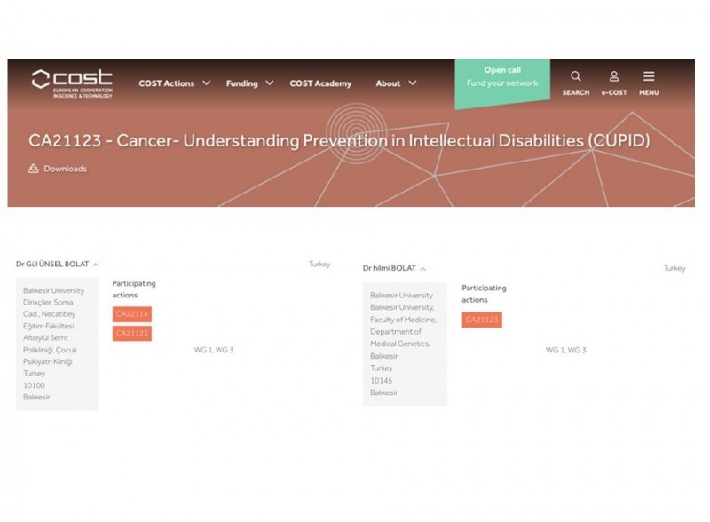 Ayrıca, Doç. Dr. Gül Ünsel Bolat ve Tıbbi Genetik Anabilim Dalı akademisyenlerinden Doç. Dr. Hilmi Bolat’ın, CA21123 - Cancer- Understanding Prevention in Intellectual Disabilities (CUPID) isimli COST aksiyonuna üyelikleri de kabul edildi. Doç. Dr. Gül Ünsel Bolat ve Doç. Dr. Hilmi Bolat, katıldıkları çalışma gruplarında zihinsel yetersizliği olan bireylerde kanser tanısındaki gecikmelerin önüne geçmek üzere çalışmalarını sürdürecek.