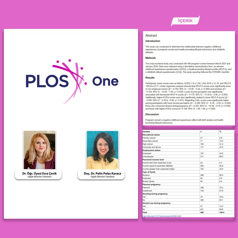 Balıkesir Üniversitesi akademisyenlerinden Dr. Öğr. Üyesi Esra Çevik ve Doç. Dr. Pelin Palas Karaca tarafından yürütülen “The relationship of adverse childhood experiences of pregnant women with healthy lifestyle behaviours and birth attitudes: a cross-sectional study” başlıklı çalışma, uluslararası dergi sıralamasının en üst dilimlerden olan Q2 ölçeğindeki “Plos One” dergisinde yayımlandı.