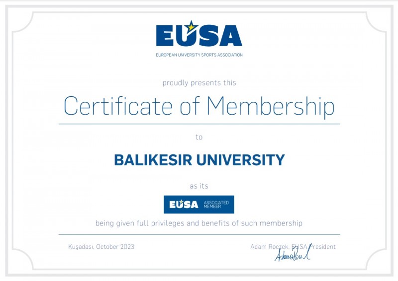 Balıkesir Üniversitesi Spor Bilimleri Fakültesi tarafından başvurusu gerçekleştirilen, Avrupa Üniversite Sporları Birliği’ne (EUSA-European University Sports Association) ortak üye olma talebi, Balıkesir Üniversitesinin Asli Üye Statüsü elde etmesi ile sonuçlandı.