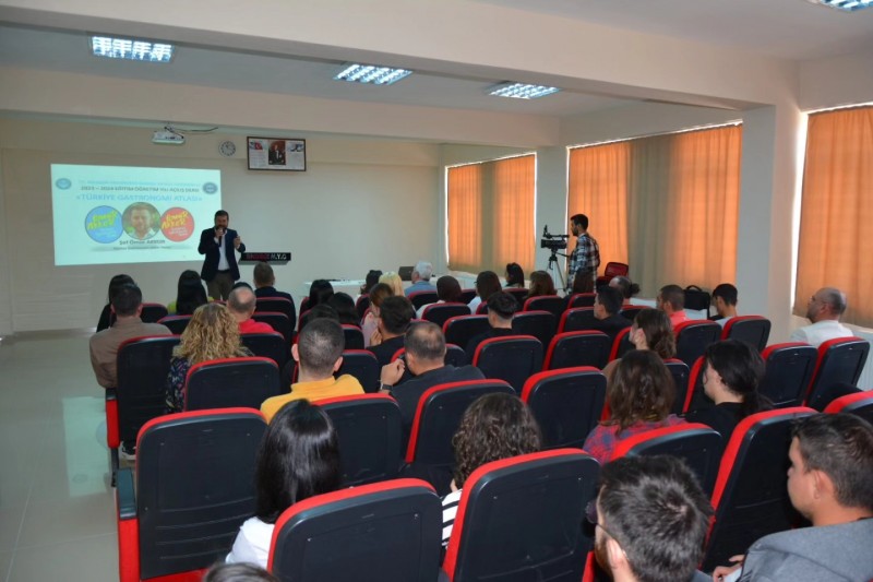 Etkinlikte, Meslek Yüksekokulu Müdürü Dr. Öğr. Üyesi Esat Saçkes ve Sındırgı Belediye Başkanı Ekrem Yavaş’ın konuşmalarından sonra, davetli konuşmacı Şef Ömür Akkor, “Türkiye Gastronomi Atlası” sunumu ile açılış dersini verdi.