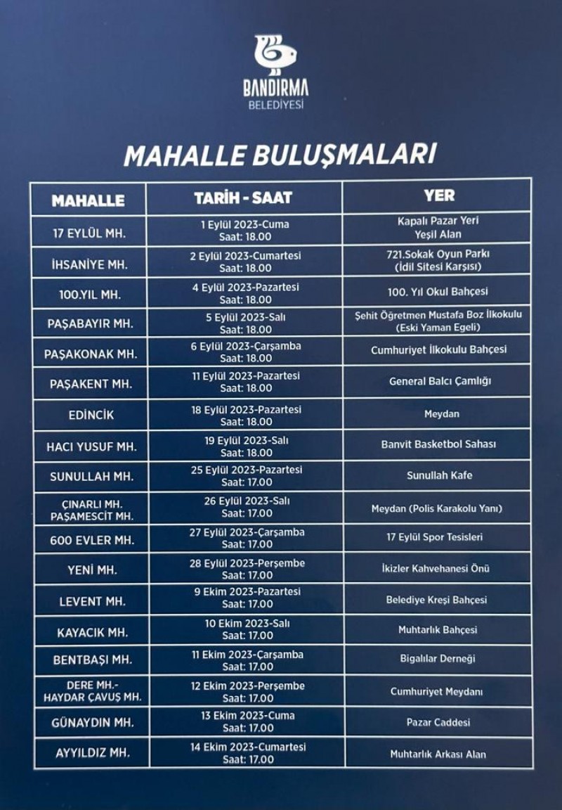 İlk buluşma 17 Eylül Mahallesi’nde yaşayan vatandaşlar için düzenlenecek. Vatandaşlar, 1 Eylül Cuma Günü, Saat 18.00’da Bandırma Belediyesi Kapalı Pazar Yeri ve Yaşam Alanı’nda düzenlenecek buluşmada, Belediye Başkanı Av. Tolga Tosun ile bizzat görüşüp fikir, öneri, istek ve projelerini paylaşma fırsatı bulacak.