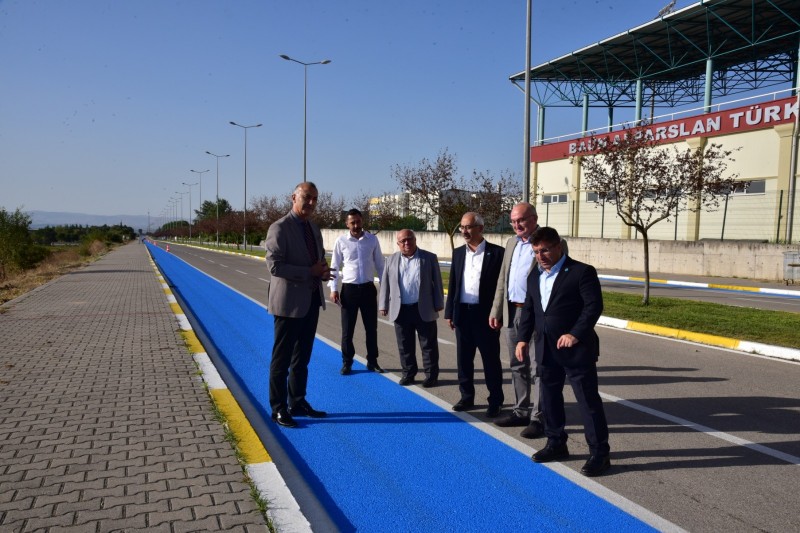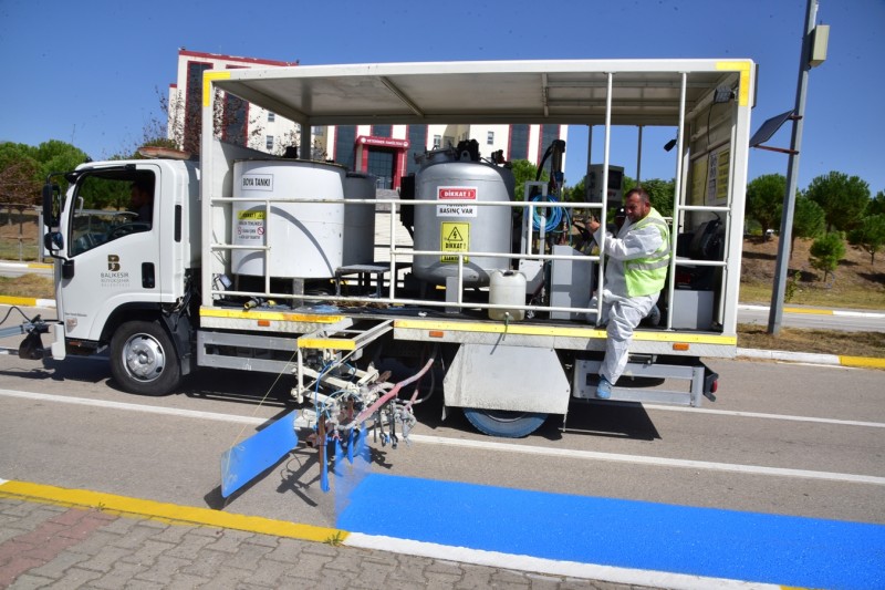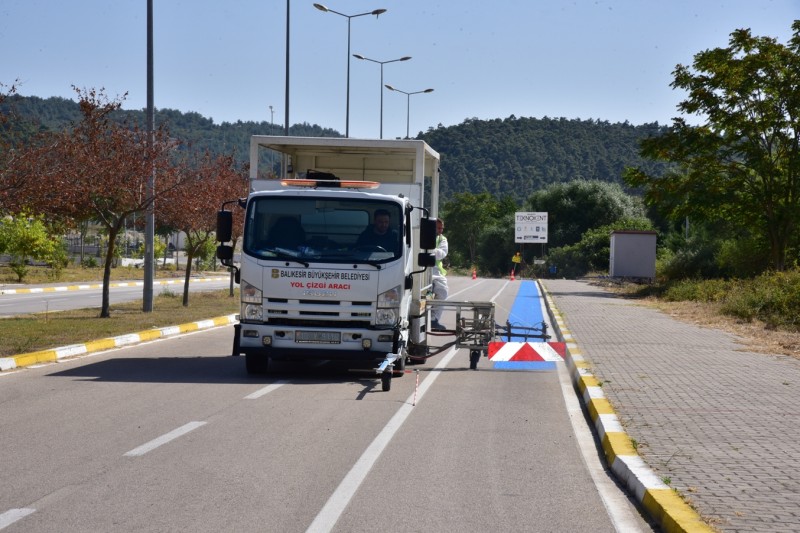 Çalışmalar kapsamında, yerleşkedeki bisiklet yolunda da düzenleme yapılarak mevcut yol üzerinde mavi renk boyama ile ayrım sağlanıyor.