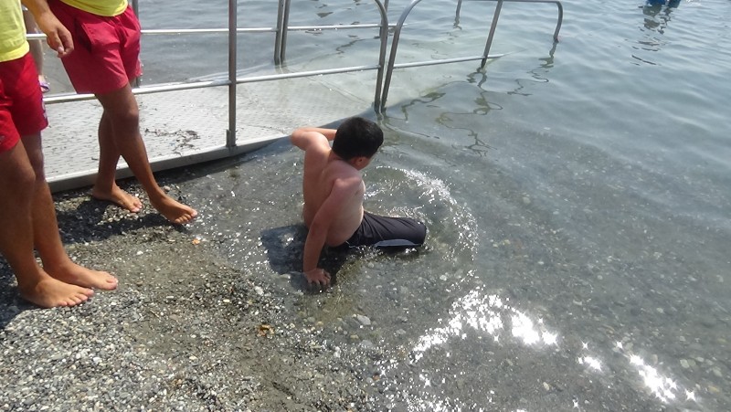 Belediye Başkan Yardımcısı Tayfun Canlı’nın eşlik ettiği Güleç, tekerlekli sandalyesi ile ilk kez denize girip unutamayacağı bir gün yaşadı.
