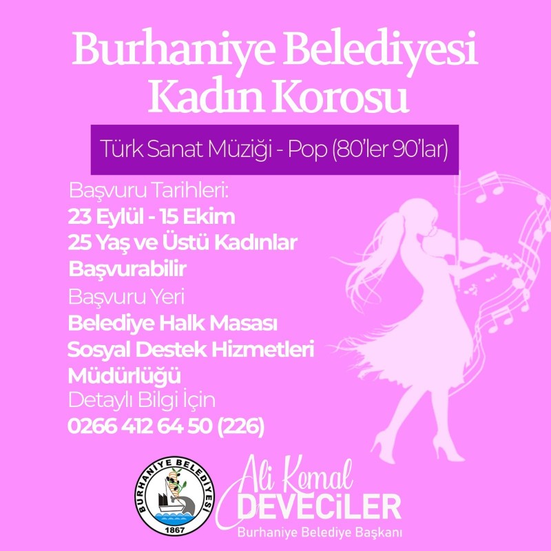 Burhaniye Belediyesi, kadın korosu için kayıtlar başladı. 15 Ekim tarihine kadar sürecek kayıtlar için, 25 yaş ve üstü kadınlar Belediye Hizmet Binasında yer alan Halk Masası’ndan başvurularını yapabilecekler. 80’ler 90’lar Pop ve Türk Sanat Müziği ile ilgili çalışmalar yapacak koro merakla bekleniyor. Tiyatro kursu ve koro başvurularının alındığını belirten Başkan Ali Kemal Deveciler, “Gerek Gençlik Merkezi’ndeki kurslarımızla gerek BBKT ve yeni kurulan Kadın Koromuz ile yıl boyu, Burhaniye’miz de sanat adına işler yapmaya devam ediyoruz” dedi.