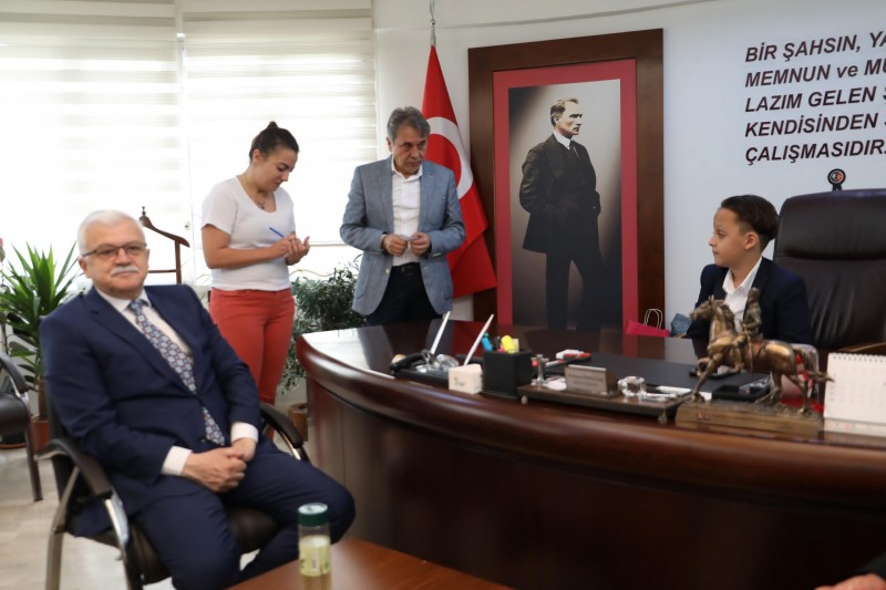 Can Kuyumcu’nun heyecanına ortak olan Belediye Başkanı Ali Kemal Deveciler yapmış olduğu konuşmada, “Öncelikle evladımıza öğrenim hayatında başarılar diliyor ve nice güzel makamlarda olmasını temenni ediyorum. Bu güzel ziyaretlerinden dolayı hem ilçe milli eğitim müdürlüğümüze hem de evladımız Can’a çok teşekkür ediyorum. Bugün temsil olarak devrettiğimiz makamımızda oturan bu güzel yavrumuzun gelecekte en iyi yerlerde olmasını ve nice güzel büyük başarılar elde etmesini diliyorum. Bu vesile ile tüm çocuklarımızın 23 Nisan Ulusal Egemenlik ve Çocuk Bayramı’nı kutluyorum,” ifadelerini kullandı.