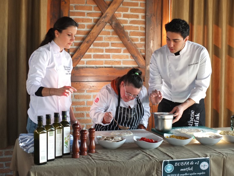 Balıkesir Üniversitesine bağlı Burhaniye Uygulamalı Bilimler Fakültesinde (BUBFA) takım çalışması dersi çerçevesinde çeşitli projeler yürütülürken, Gastronomi ve Mutfak Sanatları Bölümü 3. sınıf öğrencileri de down sendromlu gençler için BUBFA ile Engelleri Aşalım, Engelsiz Yaşayalım projesini hayata geçirdi. Gömeç Karaağaç Mahallesindeki Özlemle Yaşam Tesislerine giden down sendromlu gençler, Gastronomi ve Mutfak Sanatları bölümü öğrencileri ve şef Gizem Manisalı öncülüğünde mutfağa girdi ve yemek hazırladı. Gastronomi ve Mutfak Sanatları 3. sınıf öğrencisi Emrah Erzaim, "Burhaniye Uygulamalı Bilimler Fakültesi 3. sınıf öğrencileri olarak bu projeyi hazırladık. Bugün Dekanımız Mehmet Oğuzhan İlban önderliğinde yürüttüğümüz projede takım çalışması projesinde down sendromlu bireylerle bir araya geldik. Onlarla birlikte yemek yaptık ve yemek yapmada engelin olmayacağını hep birlikte kanıtladık" dedi.
