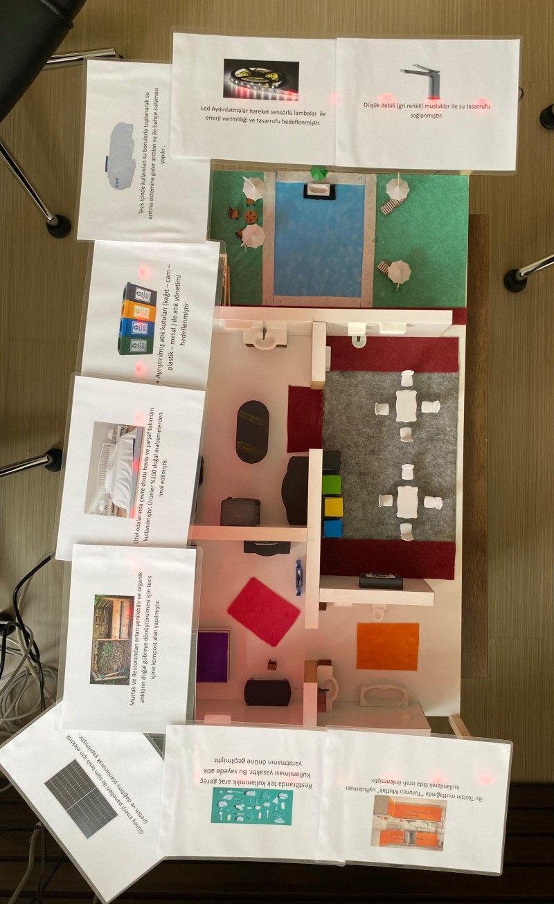 Proje sürecinde, sıfır atık prensiplerine uygun konaklama tesislerinde bulunması gereken uygulamalar, imgeler ve araçlar hakkında kapsamlı bir araştırma gerçekleştirildi. Araştırma sonuçları doğrultusunda ve bilirkişi görüşleri alınarak maketin taslağı oluşturuldu. Hazırlanan makette mutfak, restoran, banyo, otel odası ve bahçe alanları ayrı bölümler halinde tasarlanarak her alanda sıfır atık tesislerinde bulunması gereken uygulamalara yer verildi. Maketin tamamlanmasının ardından düzenlenen lansman etkinliği ile proje tanıtıldı. "Sıfır Atık Sonsuz Gelecek" mottosuyla hayata geçirilen projenin temel amacı; sıfır atık prensiplerine uygun bir otel modeli oluşturmak, geri dönüşüm uygulamalarının turizm sektöründe nasıl kullanılabileceğini göstermek, yeniden kullanım yöntemlerinin önemini vurgulamak ve atık azaltma uygulamalarını tanıtmaktır.