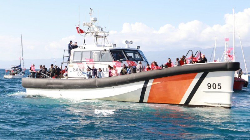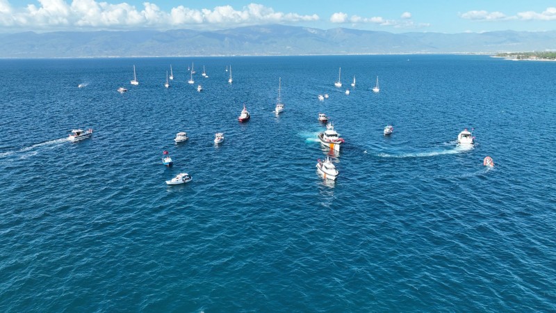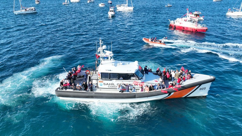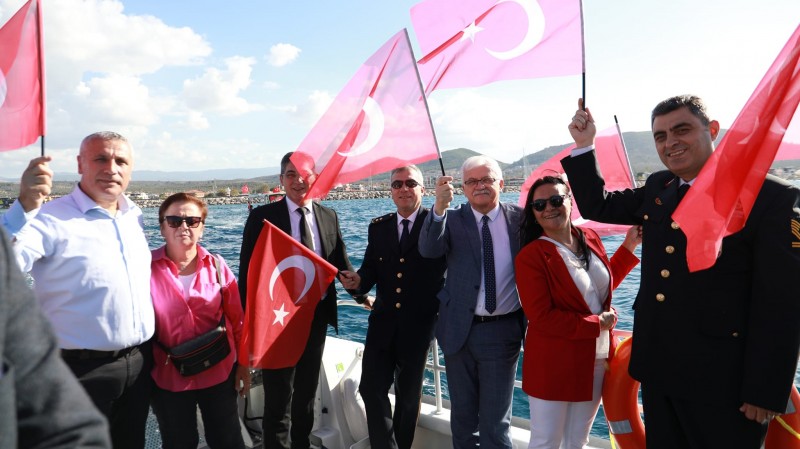 Kutlama etkinlikleri kapsamında Türk bayraklarıyla donatılan sahil güvenlik, turistik yatlar ve balıkçı teknelerinin de aralarında bulunduğu yaklaşık 50 aracın katılımıyla denizde kortej düzenlendi.