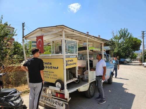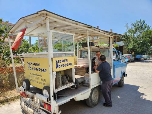 Butik dondurma dükkanının yanı sıra özel olarak tasarladığı 73 model dondurma arabası ile mahalle hayırlarını, düğünleri dolaşarak yaptığı dondurmaları dağıtıyor. Dondurmacı Cemal Dizmen, Sındırgı'nın 3. kuşak dondurmacısı olarak tam 60 senedir aile mesleğini sürdürüyor.