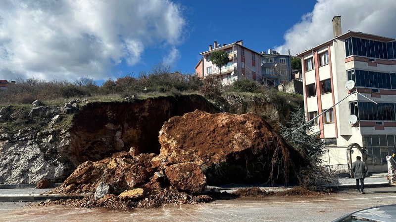 Dursunbey ilçe merkezi Balıkesir Caddesi üzerinde bulunan boş arsadaki dev kaya parçası yoğun yağışlar sonrası kaldırım üzerine düştü. Kayanın devrildiği anlar güvenlik kamerasına yansırken, olay anında bölgede kimsenin bulunmaması faciayı önledi.