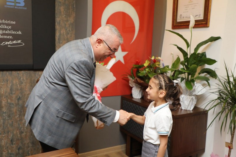 Edremit Belediye Başkanı Mehmet Ertaş, Karagözoğlu İlkokulu 1. Sınıf öğrencisi Begüm Taşkıran, Müdür Yardımcısı Hatice Tokatlı ve sınıf öğretmeni Sonay Yılmaz’ı kabul etti.