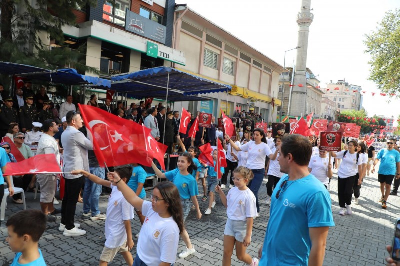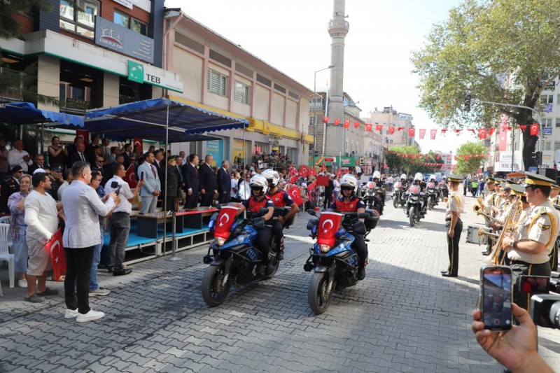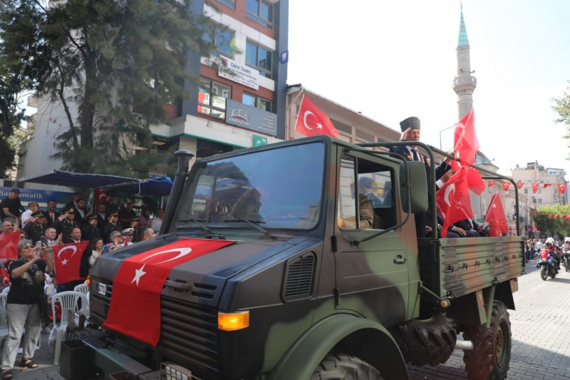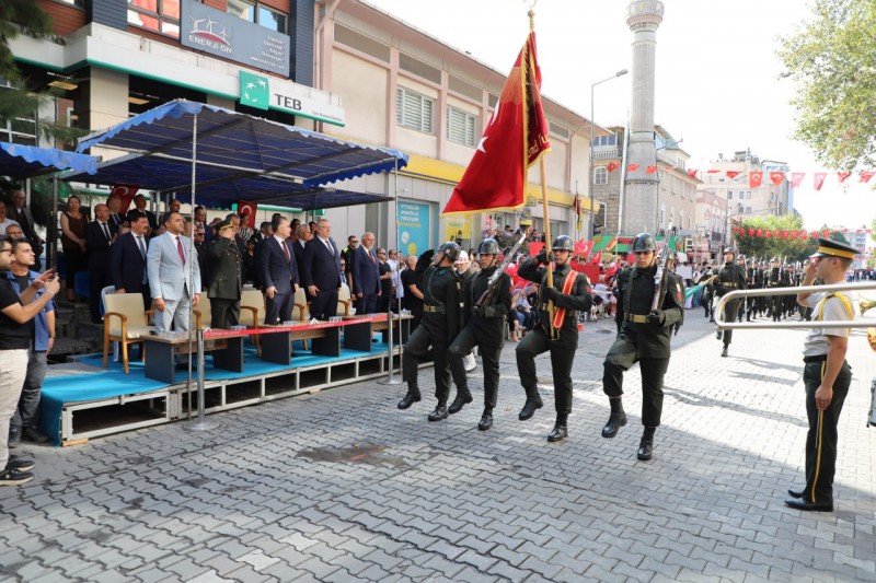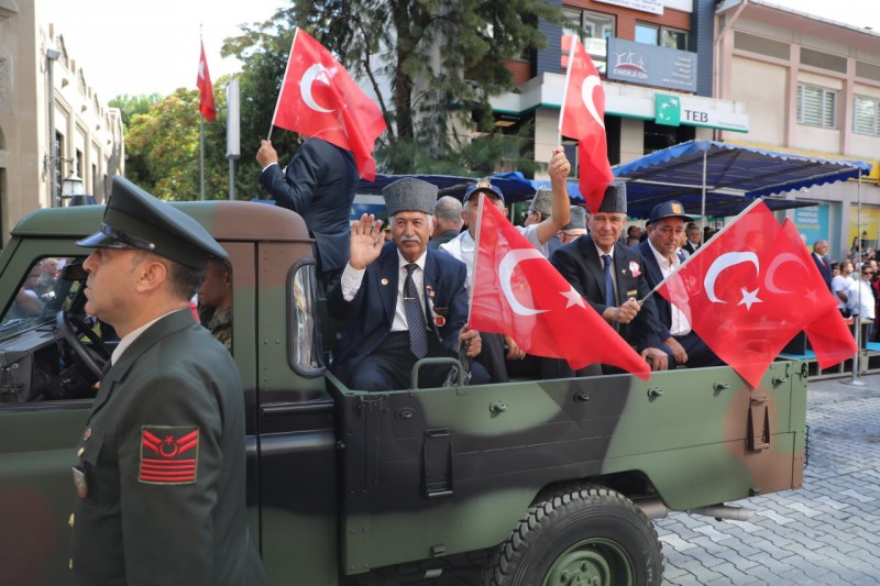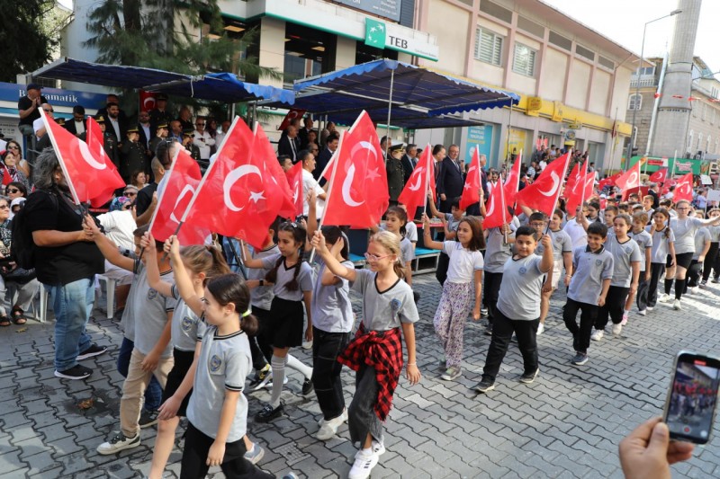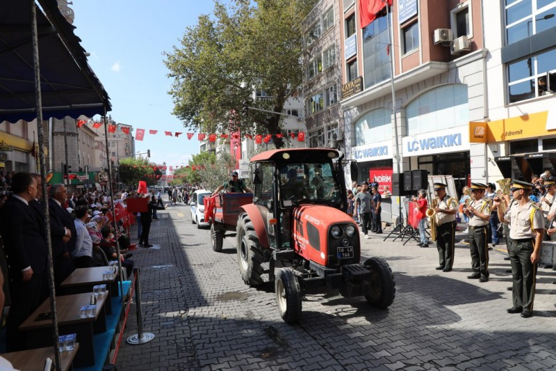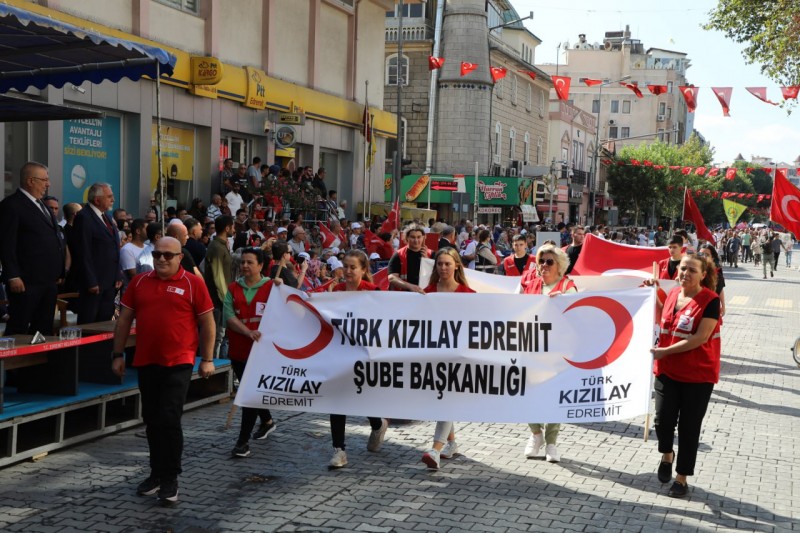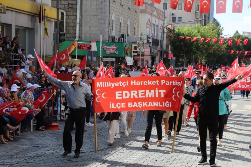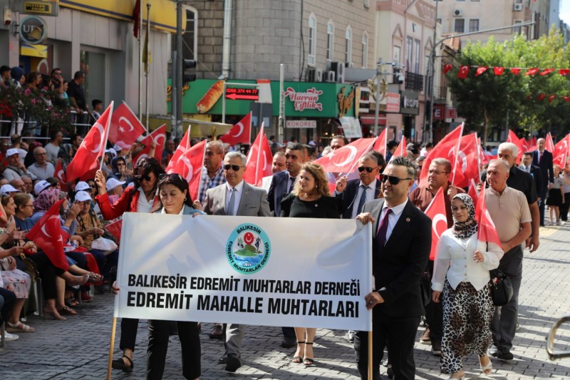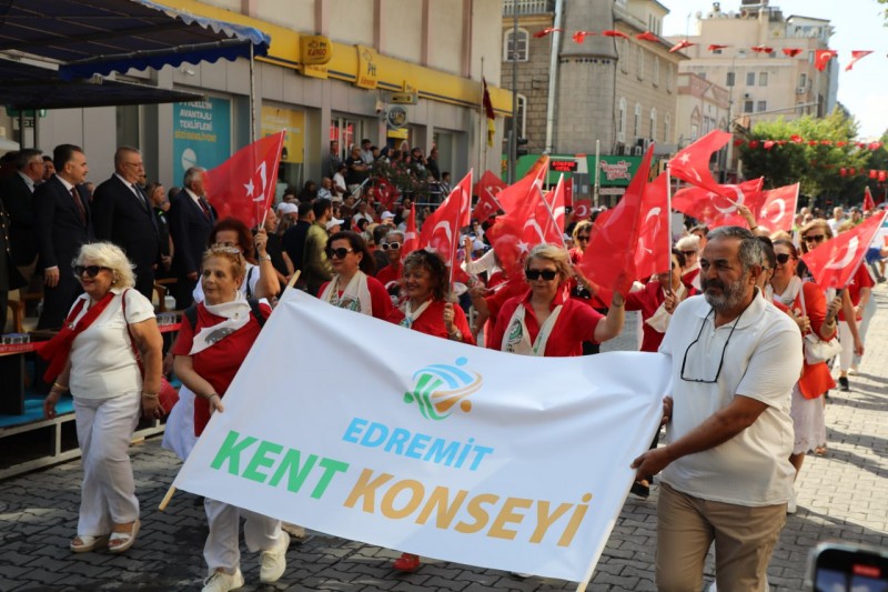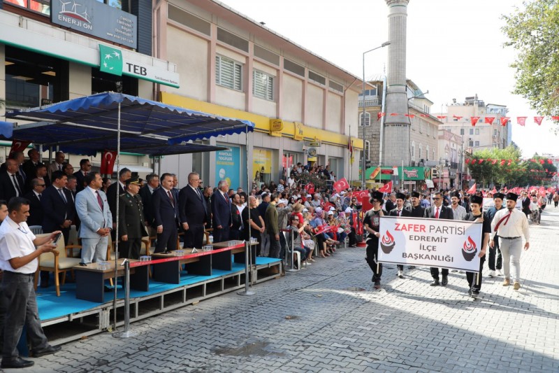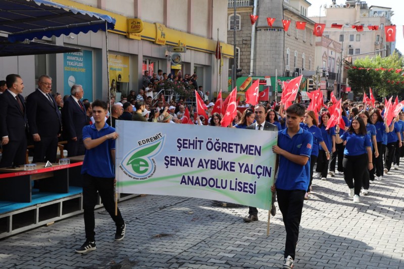 Cumhuriyet Meydanı’ndaki program, öğrencilerin şiirlerini okumasıyla sona erdi. Ardından Menderes Bulvarı’nda Edremit Belediyesi Halk Oyunları ekibinin gösterisi sahnelendi. Gösteri sonunda efeler tarafından Türk Bayrağı takdim edildi. Geleneksel geçit töreninde ise askeri birlikler, sivil toplum kuruluşları, dernekler ve odalar kortej halinde araçlarla ve yürüyerek halkı selamladı.