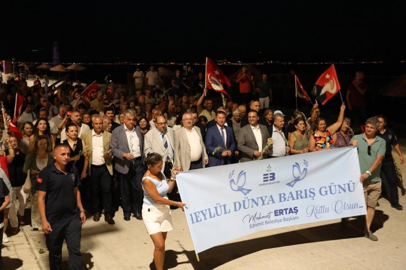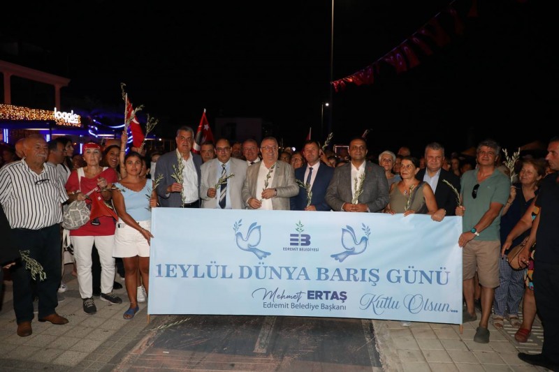 Edremit Belediyesi, 1 Eylül Dünya Barış Günü’nü etkinliklerle kutladı. Türk, Yunan ve Bulgar konukların buluştuğu bu özel günde, dostluk ve barış mesajları ön plana çıktı. Barışın simgesi olan zeytin dallarıyla el ele yürüyen Türk, Yunan ve Bulgar konuklar, barış ve kardeşlik mesajı verdi.