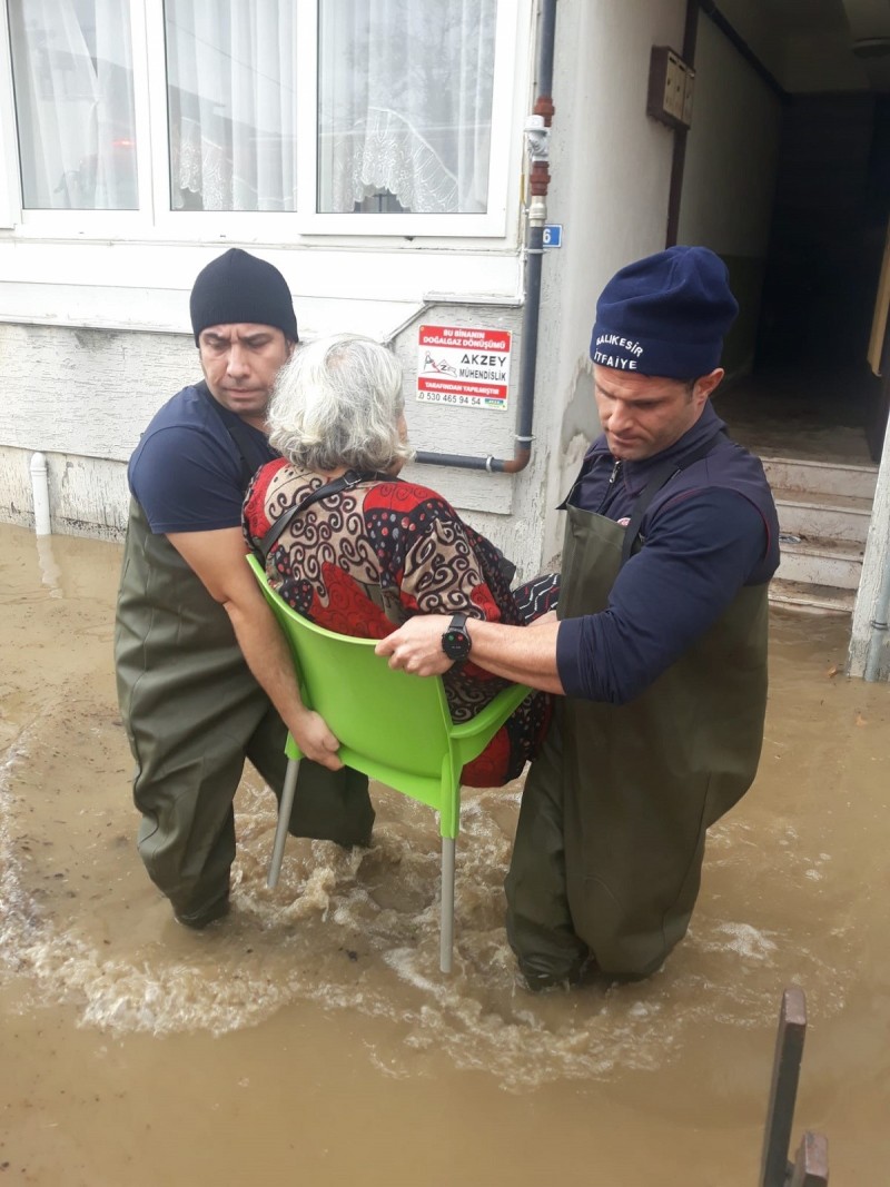 Edremit ilçesinde etkili olan yağışta sular altında kalan insanlar kimi yerde itfaiye merdiveniyle, kimi yerde itfaiye erlerinin sırtında, kimi yerde ise sandalye ile taşınarak kurtarıldı.