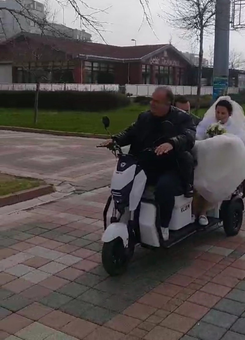 Bandırma Engelliler Derneği Başkanı Hüseyin Uçar, Tepe ve Atakök çiftinin özel günlerine renk katmak amacıyla çevreci bir alternatif olan elektrikli scooterı gelin arabasına dönüştürdü. Nikahları Bandırma Nikah Salonu'nda gerçekleşen çift, gelin arabası olarak kullanacakları elektrikli scooterla büyük bir mutluluk yaşadı.