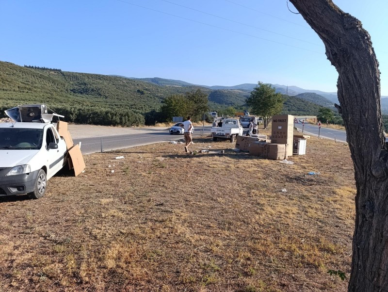 Erdek-Bandırma karayolunda meydana gelen trafik kazasında, beyaz eşya yüklü bir kamyonet devrildi.