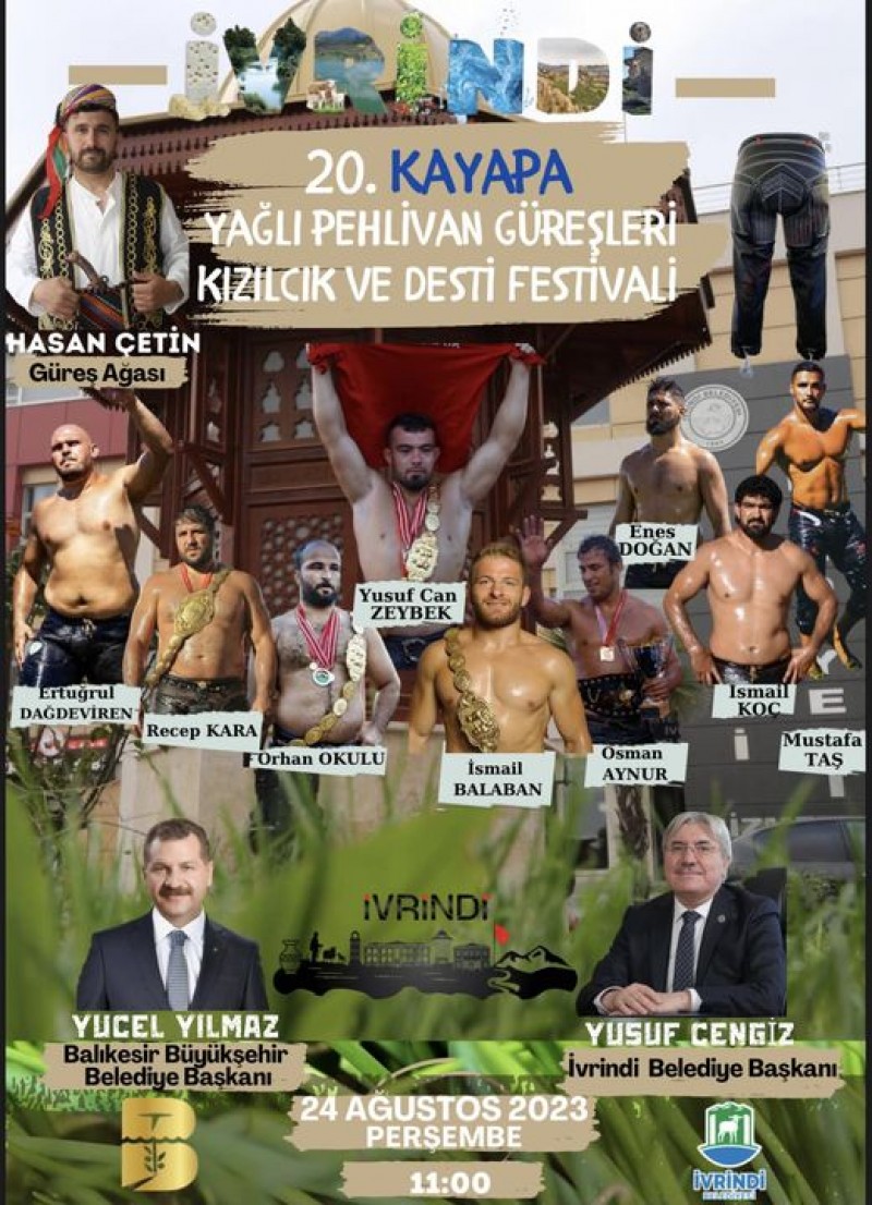 İvrindi Belediyesi'nin sosyal medya hesabında yayınlanan gönderi ile Kayapa Yağlı Pehlivan Güreşleri Kızılcık ve Desti Festivali ve Pehlivanların Kayapa er meydanında kol bağlayacağı güreşlere tüm güreş severler davet edildi. (Haber Merkezi)