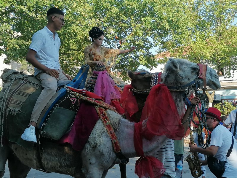 Balıkesir'in Manyas ilçesinde Roman gelin ve damat deve üzerinde ve bando eşliğinde ilçe turu yaparak vatandaşları düğünlerine davet etti.