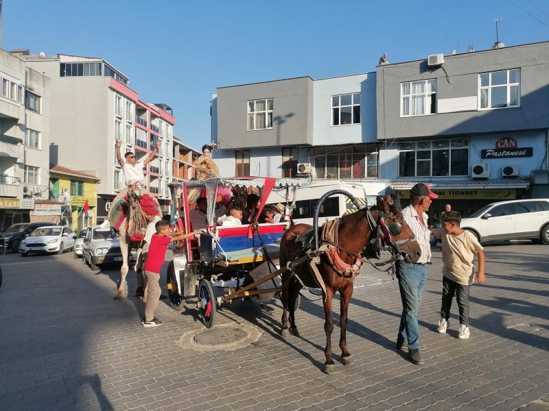 Gelin ve damat düğün öncesi kiralanan iki deve ve çalgılar eşliğinde yakınlarıyla birlikte tüm Manyas'ı dolaştı. Cumhuriyet Meydanı'nda bir süre eğlenen gelin ve damat kendilerini merakla izleyen ilçe halkını da düğünlerine davet etti. Bu arada Yandan-Metin çifti küçük oğullarının da sünnetini ağabeyinin düğünü ile birlikte yaparken onu da kiraladıkları faytonla konvoyda gezdirdi.