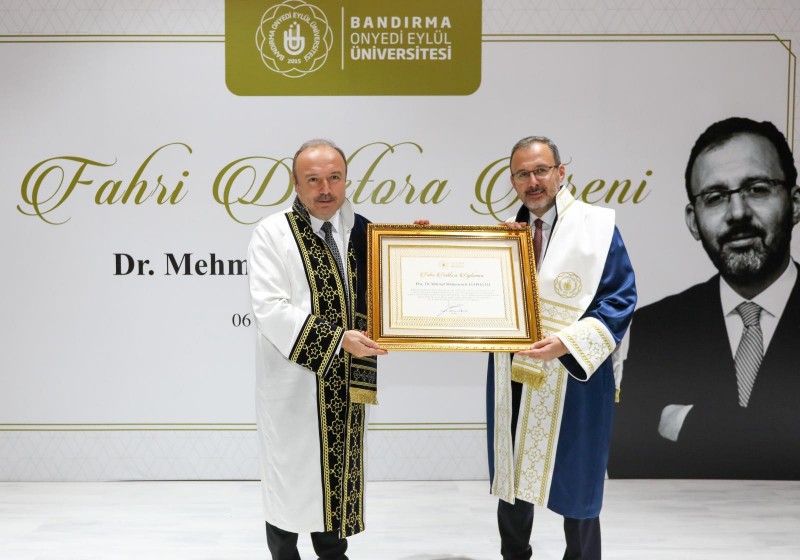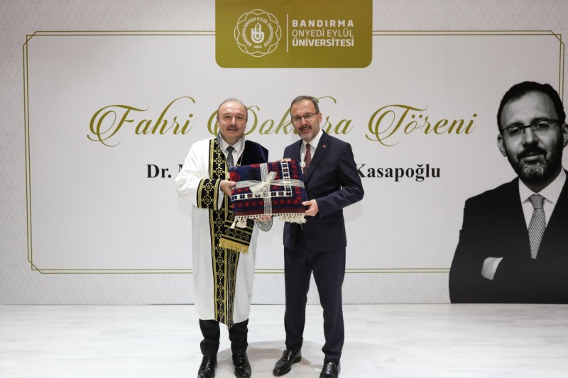 Önceki Dönem Gençlik ve Spor Bakanı ve AK Parti İzmir Milletvekili Dr. Mehmet Muharrem Kasapoğlu’na Spor Bilimleri alanında “Fahri Doktora” unvanı tevcih edildi. Bandırma Onyedi Eylül Üniversitesi Rektörü Prof. Dr. Süleyman Özdemir’in ev sahipliğinde Prof. Dr. Fuat Sezgin Konferans Salonunda gerçekleşen programa, Önceki Dönem Gençlik ve Spor Bakanı ve AK Parti İzmir Milletvekili Dr. Mehmet Muharrem Kasapoğlu, Bandırma Kaymakamı Engin Aksakal, Cumhuriyet Başsavcısı Cüneyt Demirdaş, Balıkesir İl Gençlik ve Spor Müdürü Adem Özalp, Rektör Yardımcıları Prof. Dr. Alpaslan Serel, Prof. Dr. Celalettin Yanık, Genel Sekreter Cihangir Boz, ilçe protokolü, basın mensupları, akademik ve idari personel ile öğrenciler katıldı.