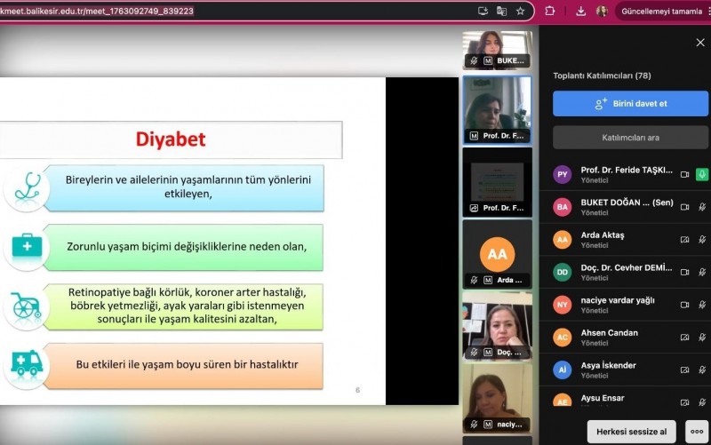 Program kapsamında Sakarya Uygulamalı Bilimler Üniversitesinden Prof. Dr. Feride Taşkın Yılmaz, diyabetin günümüzde hızla artan bir halk sağlığı sorunu olduğuna dikkat çekerek erken tanı ve bakımın önemini anlattı. Hacettepe Üniversitesinden Prof. Dr. Naciye Vardar Yağlı, diyabet yönetiminde fiziksel aktivitenin etkilerini bilimsel kanıtlarla açıklayarak egzersizin tedavi sürecindeki rolünü vurguladı. Toros Üniversitesinden Dr. Öğr. Üyesi Gonca Yıldırım ise sürdürülebilir beslenme, kan şekeri yönetimi ve diyabette doğru beslenme ilkeleri hakkında güncel bilgiler paylaştı.