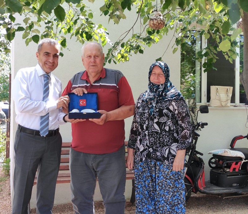 Aynı mahallede ikamet eden Kıbrıs Gazisi Seyfi Aydın’ı da ziyaret eden, Kaymakam Atasoy, kendilerine Milli Mücadele Madalyası ve Berat takdim etti. (İHA)