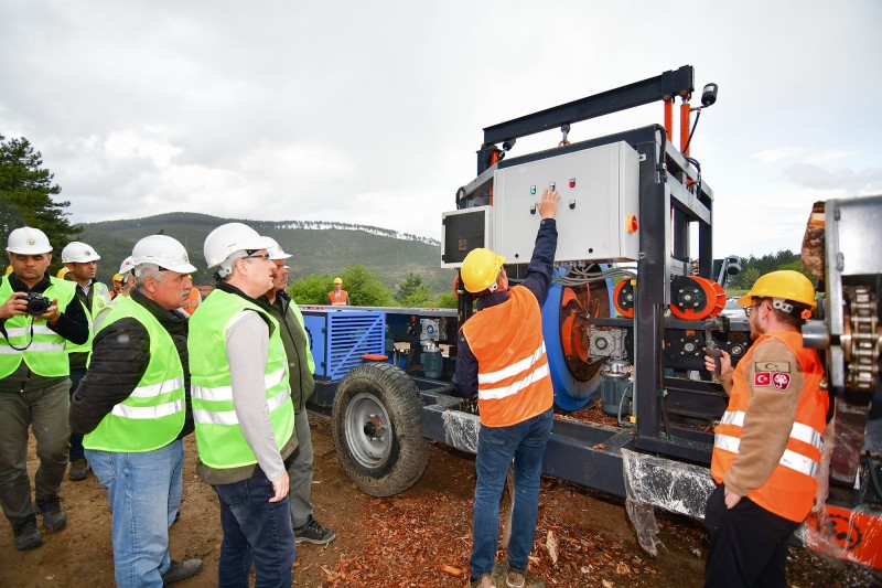 Yeni Nesil Kabuk Soyma Makinesinin çalışmasını yerinde inceleyen Balıkesir Orman Bölge Müdürü Kemal Kayıran, firma yetkilisinden makinenin işleyişi ve çalışması hakkında bilgiler aldı. Üretim işçilerinden de makinenin iş verimini artırdığını, üretim işlerini kolaylaştırdığını 3 günde yapılacak işin bir günde yapıldığına dair memnuniyet bilgilerini alarak, makinenin daha da geliştirilmesi tavsiyesi ile yeni makinenin orman köylüsüne hayırlı olması temennisinde bulundu.