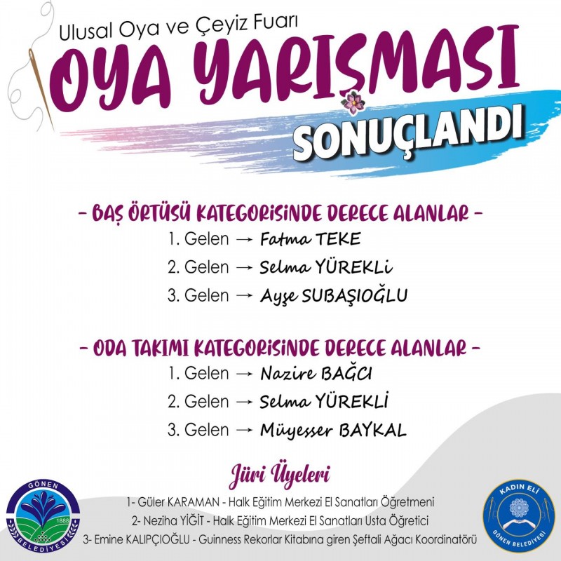 Gönen 15. Ulusal Oya ve Çeyiz Festivali etkinlikleri içinde yer alan ve iki dalda yapılan iğne oyası yarışmasında başörtüsü ve oda takımı ile Gönenli Kadınlar hünerlerini sergiledi.