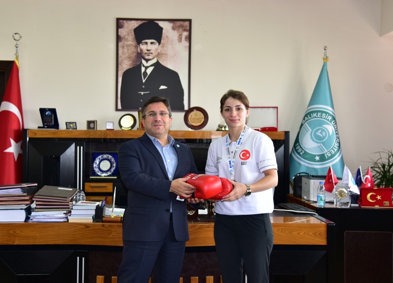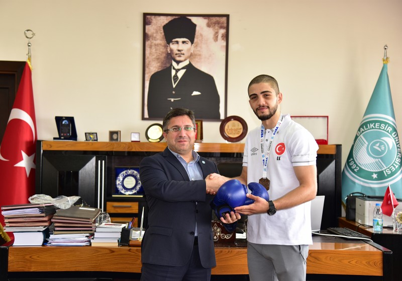 Balıkesir Üniversitesi (BAÜN) Rektörü Prof. Dr. Yücel Oğurlu, Üniversiteler Kickboks Avrupa Şampiyonasında (EUSA 2023) ülkemize 1 altın ve 1 bronz madalya kazandırarak üniversiteyi başarıyla temsil eden Güler Deniz Topuz ve Barış Karaman ile bir araya geldi.