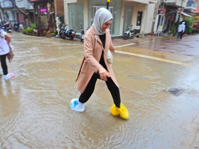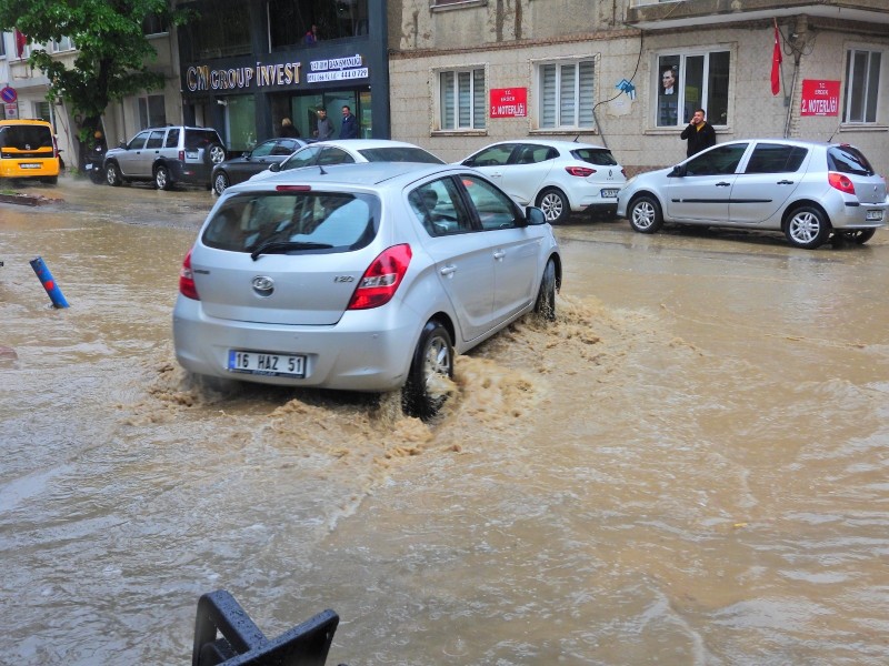 Balıkesir'in Erdek ilçesinde etkili olan sağanak yağış nedeniyle yollar göle döndü. Araç sürücüleri ve yayalar zor anlar yaşadı.