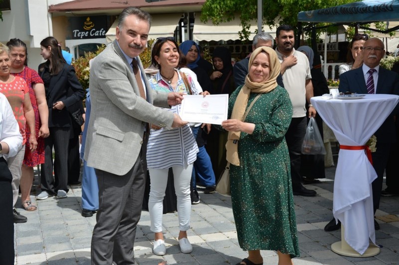 Edremit kent merkezinde bulunan Anıt Çeşme ve Kültür Meydanında düzenlenen sergi etkinlinde; sera altı bitkisel üretim, okuma yazma, Kur’an-ı Kerim, tığ oyası, sıfır atık, tekstil, aşçılık gibi kursları başarıyla tamamlayan, 12’si denetimli serbestlik yararlanıcısı olmak üzere toplam 53 kursiyere sertifikaları Kaymakam Odabaş tarafından verildi.