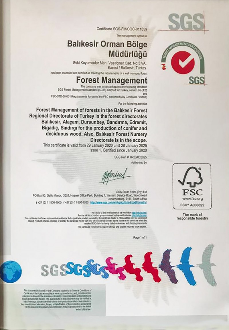 Orman Genel Müdürlüğünün "Sürdürülebilir orman yönetimi uygulamalarında öncü kurum olmak” vizyonu çerçevesinde Balıkesir Orman Bölge Müdürlüğü yürüttüğü ormancılık faaliyetlerinde uluslararası standartları sağlayarak FSC (Orman Yönetim Konseyi) sertifikasyon sistemine dahil oldu.