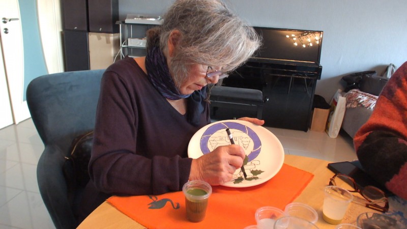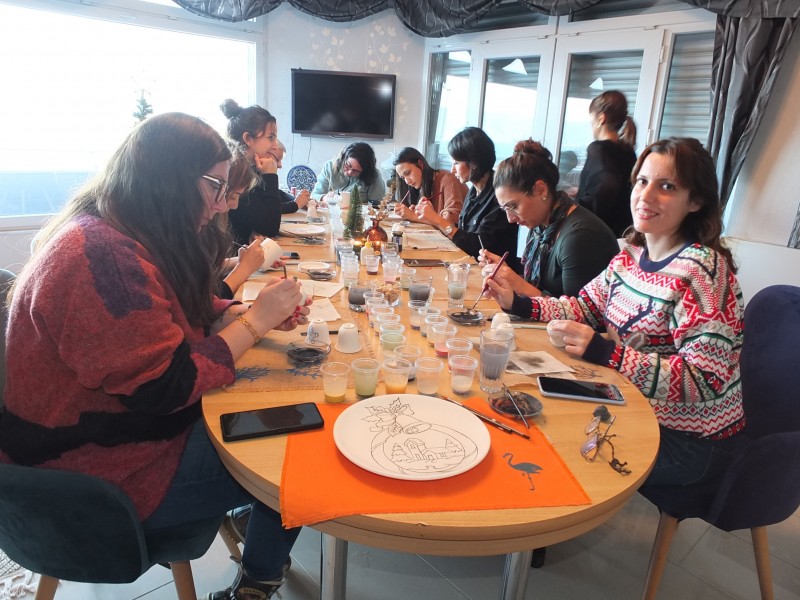 Burhaniye ilçesi Taylıeli Mahallesinde çini öğretmeni Ezgi Demir’in atölyesine katılan kadınlar yılbaşı için çini tabak ve fincan süslemesi yaptı.