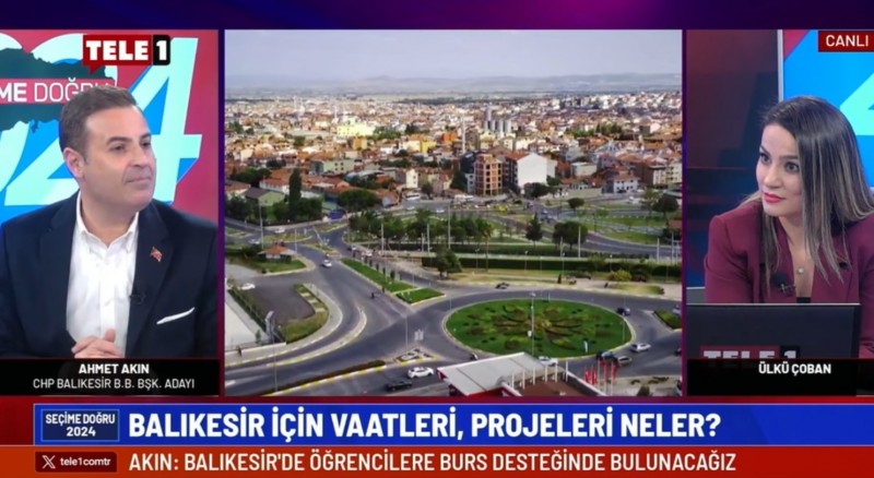 Balıkesir Büyükşehir Belediye Başkan Adayı Ahmet Akın, TELE1’de yayınlanan Ülkü Çoban’la Seçime Doğru programına katıldı. Akın, Türkiye’nin huzurunda Balıkesirli gençleri heyecanlandıran müjdeler verdi. Ahmet Akın, eğitimleri için Balıkesir dışına giden öğrenciler başta olmak üzere Balıkesir’de eğitim gören öğrenciler için önemli projelere imza atacağını belirterek şunları söyledi: