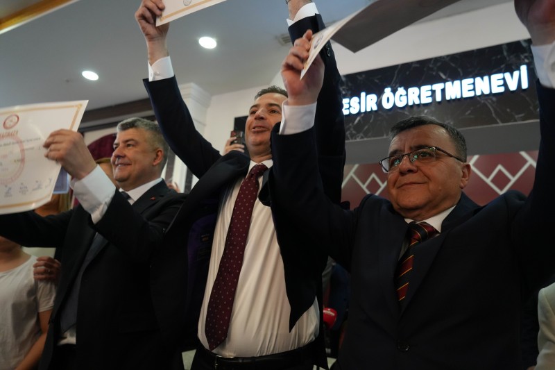 Balıkesir Öğretmenevinde düzenlenen tören ile Balıkesir Büyükşehir Belediye Başkanı Ahmet Akın, Karesi Belediye Başkanı Mesut Akbıyık, Altıeylül Belediye Başkanı Hakan Şehirli seçim görevlilerinin elinden mazbatalarını aldı. Tıklım tıklım dolu salonda tören öncesi Ahmet Akın'ın seçim şarkıları ile büyük coşku yaşandı. Törende konuşan Ahmet Akın, "Balıkesir'i Türkiye'nin parlayan yıldızı yapmak için şimdi gece gündüz demeden arı gibi çalışma zamanı. İlk günden beri söylüyorum. Makamda oturup tebrikleri kabul eden bir belediye başkanı değil, ilçelerde, köylerde, mahallelerde emekçilerle, çalışanlarla, memurlarla, iş dünyamızla beraber olan çalışkan bir belediye başkanı olacağım. Gönüller yapacağız. 10 yıl milletvekilliği yaptım. Bu sürede kimseye hangi partidensin demedim. Sadece 'Size nasıl yardımcı olayım' dedim. Her konuşmamda üstüne basa basa belediyede particilik yaptırmam dedim. Bu sözlerimi tekrarladım. Bazı hadsizler, bazı kendini bilmezler benim bilgim dışında belediye binasına parti bayrağı astılar. Cumhuriyet Halk Partili olmaktan gurur duyuyorum ama partimizin bayrağının yeri belediye binası değildir. Bayrak olacaksa Türkiye Cumhuriyeti'nin al bayrağıdır" dedi.