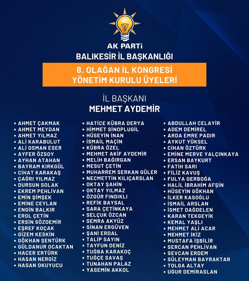 “AK Parti Balıkesir İl Başkanlığı olarak 8. Olağan Kongremizi, Cumhurbaşkanımız ve Genel Başkanımız Sayın Recep Tayyip Erdoğan'ın teşrifleriyle büyük bir coşkuyla gerçekleştirdik. Balıkesir teşkilatlarımızın güçlü birlik ve beraberliği sayesinde, kongremiz unutulmayacak bir gün olarak tarihe geçmiştir.
