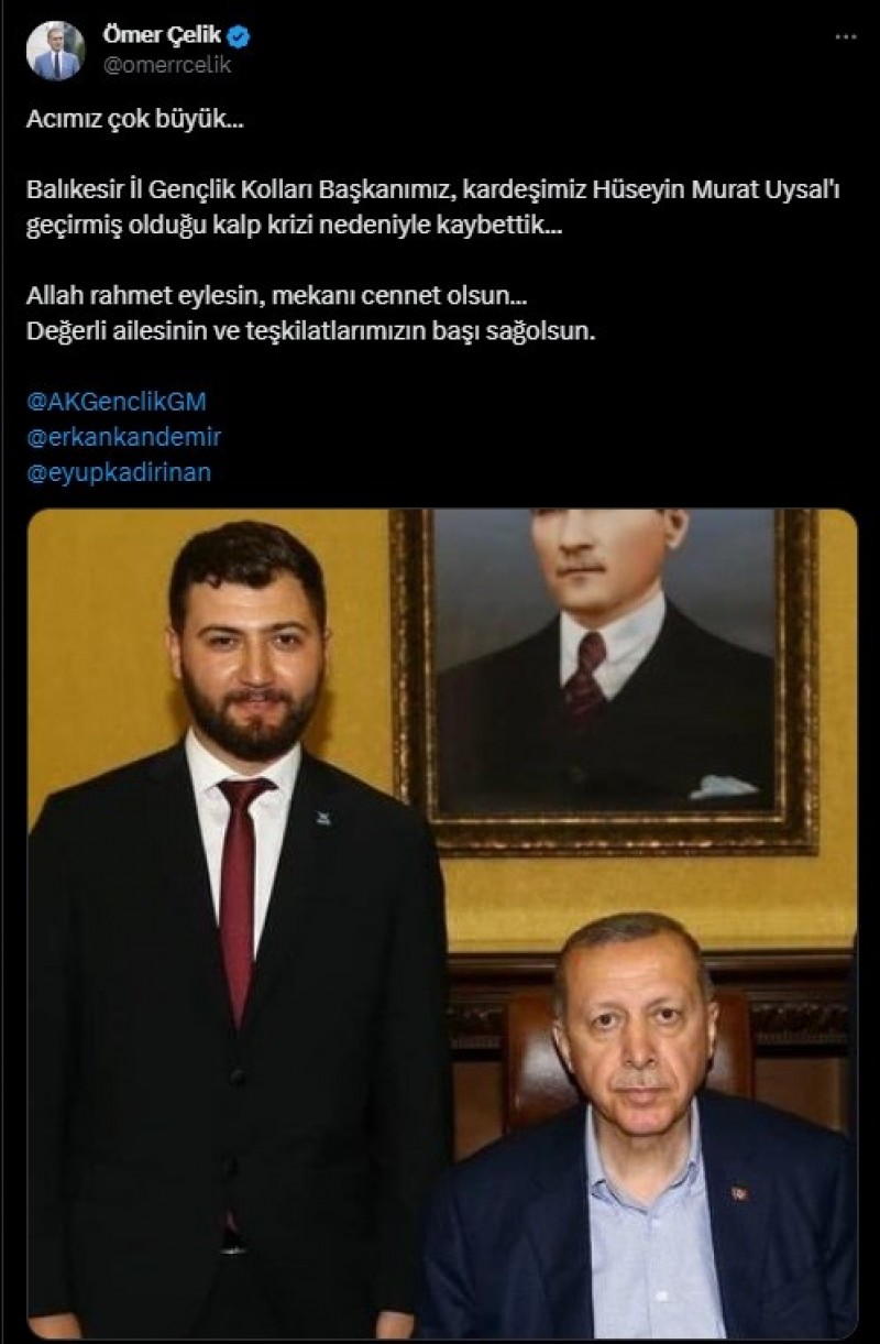 Kısa süre önce Balıkesir Atatürk Şehir Hastanesinde fıtık ameliyatı geçiren ve tedavisine evde devam edilen AK Parti Balıkesir İl Gençlik Kolları Başkanı Hüseyin Murat Uysal (31), geçirdiği kalp krizi sonucu hayatını kaybetti. Uysal’ın vefatı, yakınları, sevenleri ve partililer arasında üzüntüye neden oldu. AK Parti Sözcüsü Ömer Çelik, sosyal medya hesabından yayımladığı taziye mesajında, "Acımız çok büyük. Balıkesir İl Gençlik Kolları Başkanımız, kardeşimiz Hüseyin Murat Uysal'ı geçirmiş olduğu kalp krizi nedeniyle kaybettik. Allah rahmet eylesin, mekanı cennet olsun. Değerli ailesinin ve teşkilatlarımızın başı sağolsun" ifadelerini kullandı.