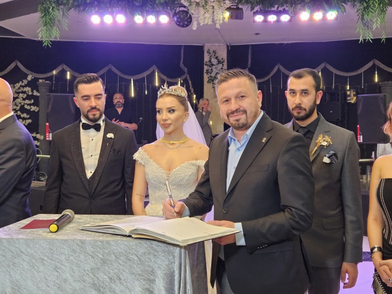 İl Yönetim Kurulu üyesi Tayfun Deniz'in oğlu Alihan ile Tuana'nın düğün törenine katılan İl Başkanı Mehmet Aydemir, Milletvekilleri İsmail Ok, Mustafa Canbey, İlçe Başkanları Hakan Aka ve Erdinç Alcan genç çiftin nikah şahidi oldular.