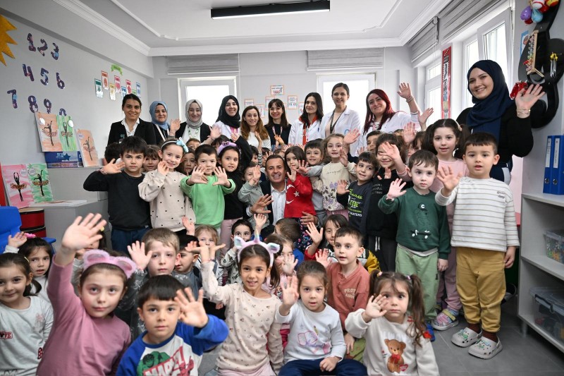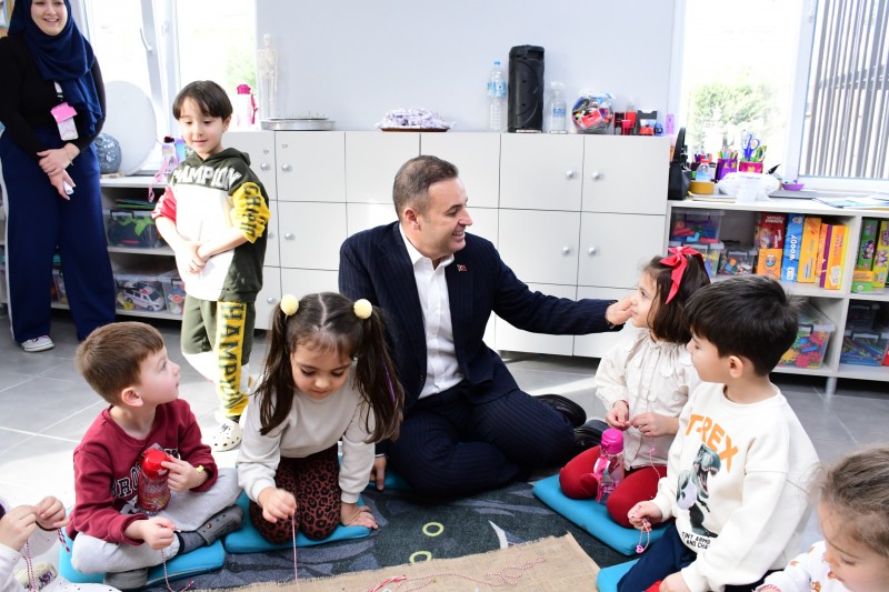 Balıkesir Büyükşehir Belediye Başkanı Ahmet Akın, BBB Kadın ve Aile Hizmetleri Daire Başkanlığına bağlı Kuvayımilliye Balçocuk Gündüz Bakımevini ziyaret etti. Toplam 76 öğrencinin eğitim gördüğü bakımevinde sınıfları tek tek gezen Akın, çocuklarla yakından ilgilendi. Miniklerle oyun oynayan Akın, sınıflarda gerçekleştirilen etkinliklere eşlik etti. Çocukların yoğun ilgisiyle karşılaşan Akın, çocukların sorularını da yanıtladı. Belediyeciliğin sadece altyapı gibi hizmetlerden ibaret olmadığını dile getiren Akın, sosyal belediyecilik anlayışıyla gönüllere dokunan projeleri tek tek hayata geçirdiklerini söyledi. Çocukların eğitim süreçleri hakkında öğretmenlerden bilgi alan Akın, miniklerin heyecanına ortak olurken onlara hediyeler dağıttı.