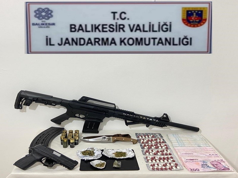Altıeylül ilçesinde jandarma ekipleri bir şüphelinin ev ve eklentilerinde yaptıkları aramalarda uyuşturucu madde, 2 adet silah, bu silahlara ait fişek ve suçtan elde edildiği düşünülen 19 bin lira ele geçirdi.