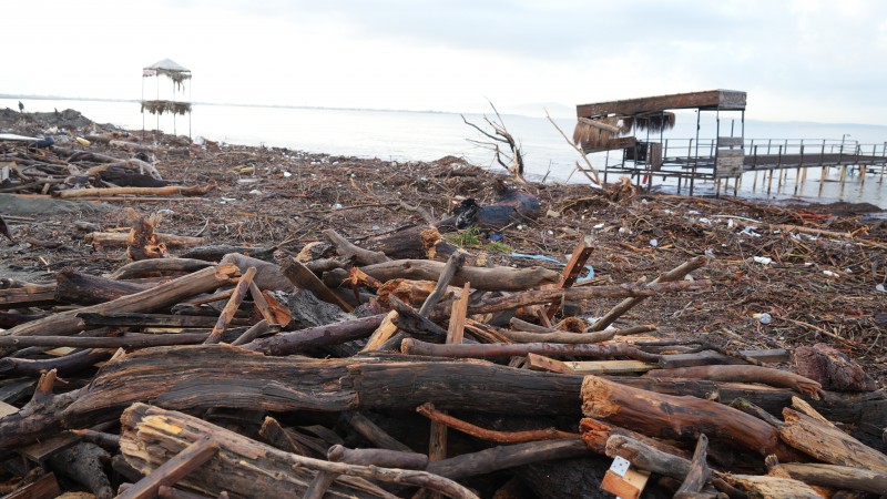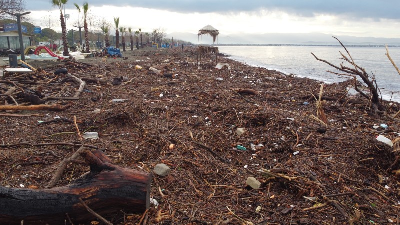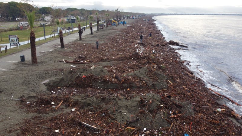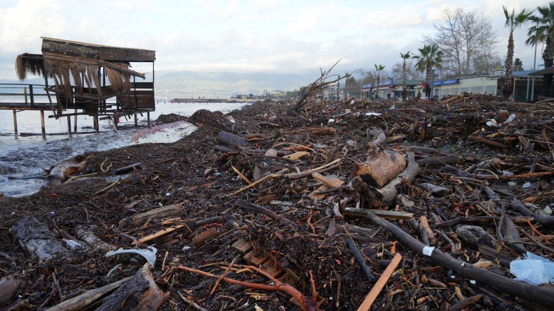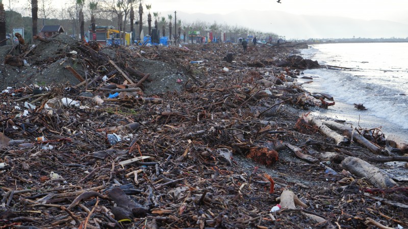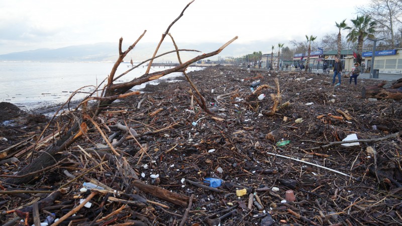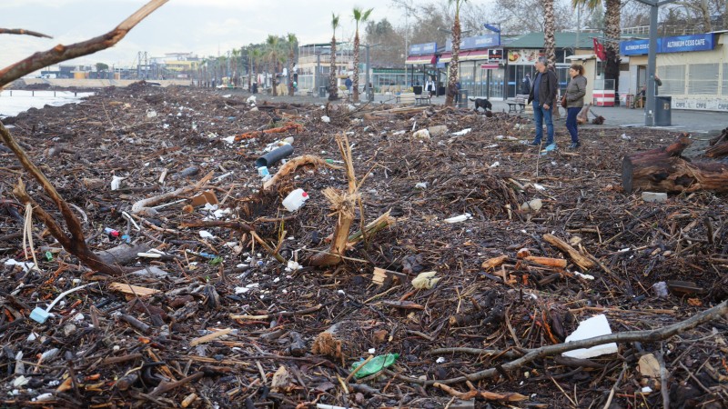 Edremit ilçesinde son iki gündür yetkili olan lodos fırtınası, sağanak yağış ve dere taşkınları sonrasında ilçenin önemli turizm merkezlerinden olan Altınkum sahili, derelerin taşıdığı tonlarca ağaç parçaları ve çöple kaplandı.
