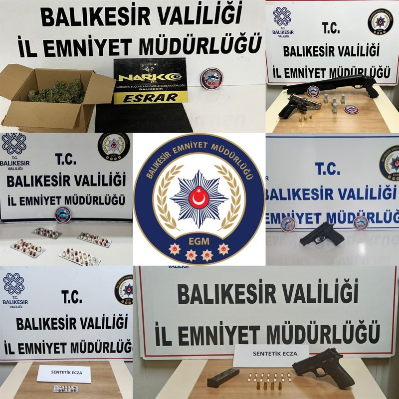 Balıkesir İl Emniyet Müdürlüğü Asayiş Şube Müdürlüğü ekipleri geçtiğimiz bir haftada şüpheli şahıslar ve araçlar üzerinde yapılan uygulamalar sonucunda 13 bin 137 şahıs sorgulandı. Sorgulaması yapılan şahıslardan aranması bulunan 63 kişi yakalandı. Yapılan denetimlerde; bir ruhsatsız tabanca ve 4 adet fişek, 2 kurusıkı tabanca, 3 ruhsatsız av tüfeği ve 4 adet kartuş, 152 sentetik ecza maddesi, 122,18 gram esrar maddesi, 11,99 gram metametamin maddesi, 2,4 gram bonzai maddesi, 0,29 gram kokain maddesi ele geçirildi. Yakalanan şüpheliler hakkında ise gerekli tahkikat yürütülmeye devam ediyor.