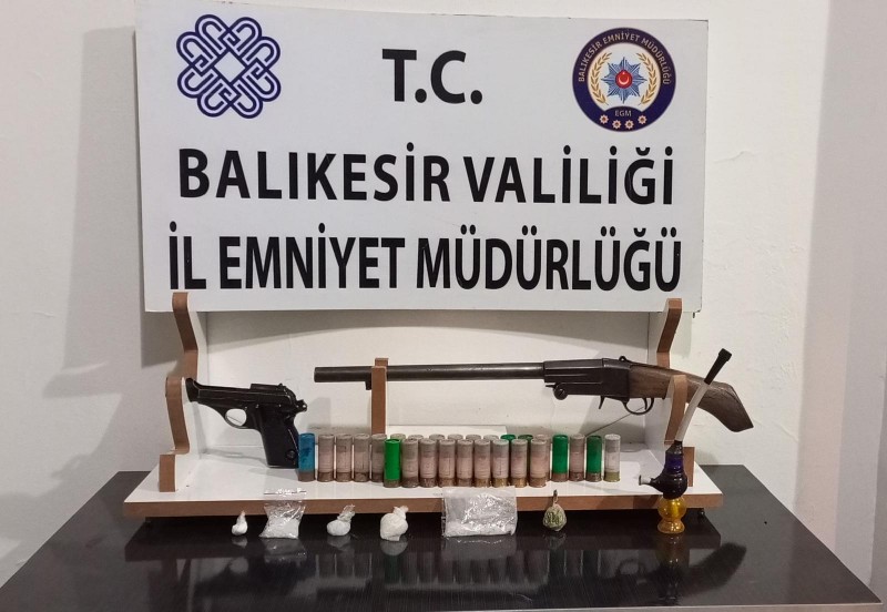 Yapılan aramalar sonucunda; 1 7.65 tabanca, 1 tüfek ve tüfeğe ait 27 dolu kartuş, 24.7 gram metamfetamin, 3.9 gram ağırlığında esrar, payp ve çeşitli tüfeklere ait parçalar ele geçirildi.