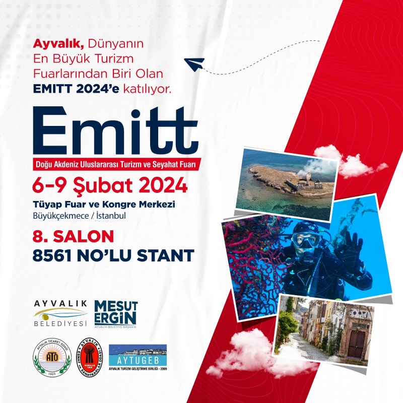 Ayvalık Belediyesi ve Doğu Akdeniz Uluslararası Turizm ve Seyahat Fuarı “İSTANBUL EMITT”te bu yıl 6-9 Şubat tarihlerinde Ayvalık Ticaret Odası ve Turizm Geliştirme Birliği (AYTUGEB) ile birlikte 8. Salon 8561 numaralı stantta yerini alıyor.