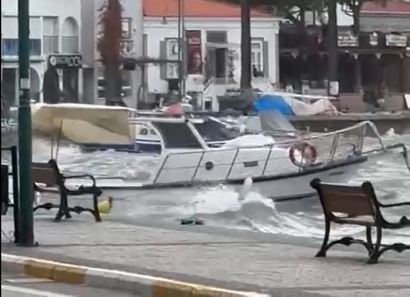 Ayvalık ilçesinde etkili olan yağışlı hava ve fırtına nedeniyle rıhtımda balıkçı tekneleri battı, bir ağaç devrildi.