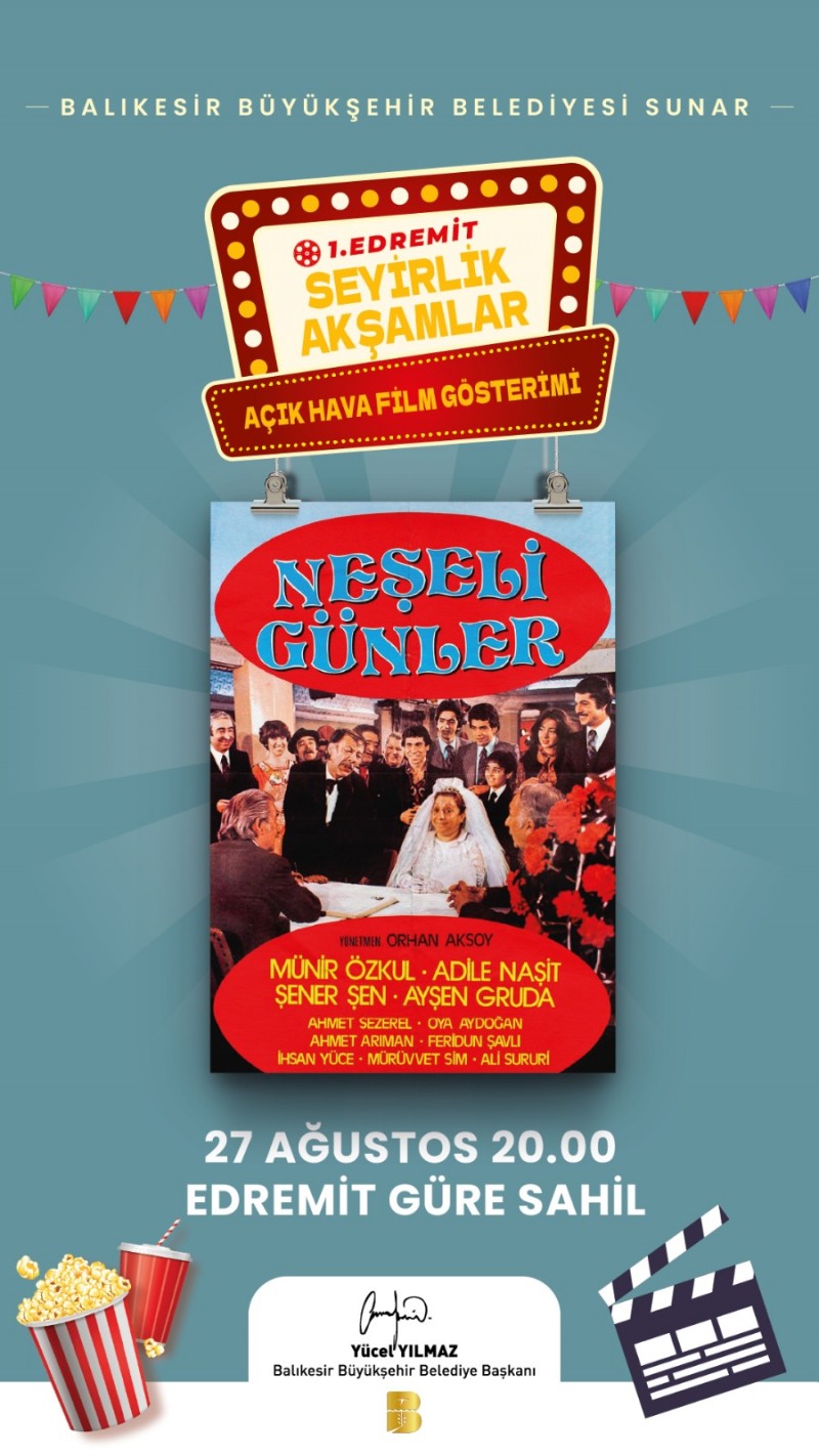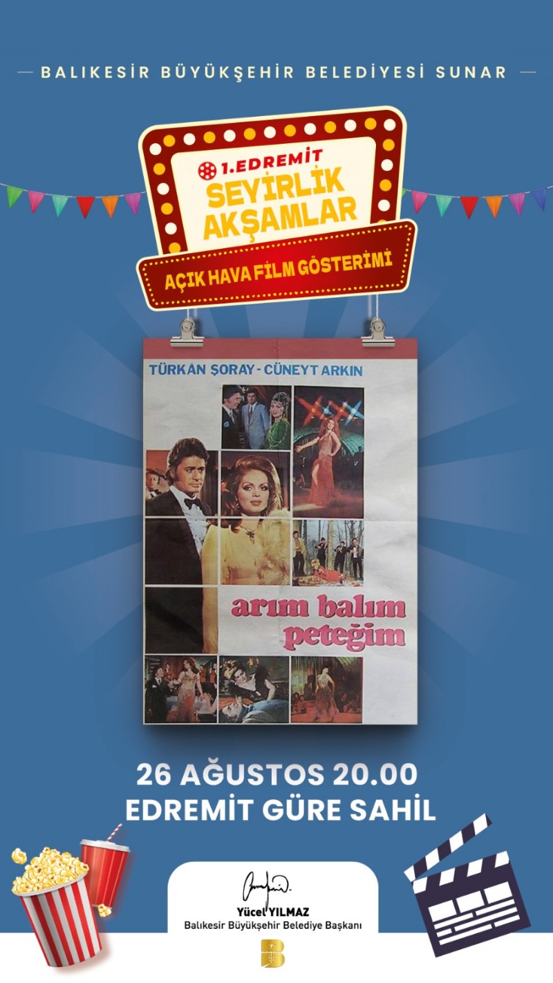 26 Ağustos Cumartesi günü Türk Sineması’nın efsane isimlerinden Türkan Şoray’ın katılımıyla; Cüneyt Arkın ile başrollerini paylaştığı “Arım Balım Peteğim” filminin gösterimi yapılacak. 27 Ağustos Pazar günü ise saat 20.00’de Yeşilçam’ın klasiklerinden, Münir Özkul, Adile Naşit gibi Türk Sinemasına damga vuran sanatçıların rol aldığı “Neşeli Günler” filmi Edremitlilerle buluşacak. (Balıkesir Büyükşehir Belediyesi)