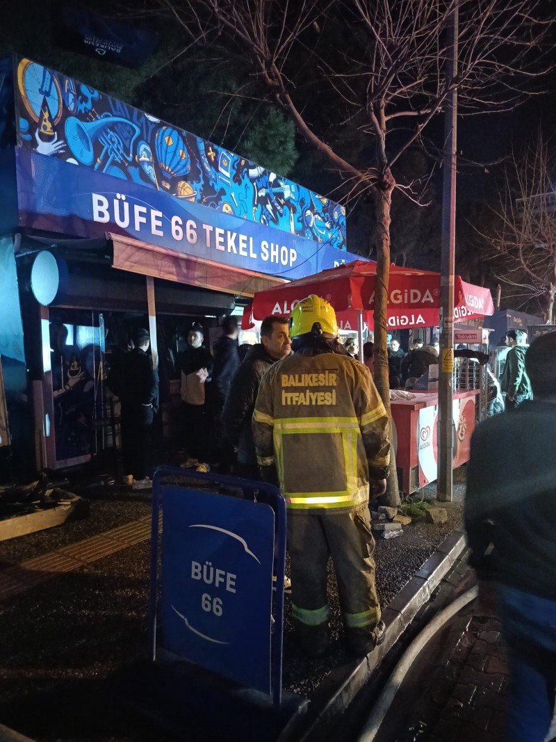 Balıkesir’in Edremit ilçesinde tütün mamulleri ve alkollü içecek satışı yapılan bir büfede çıkan yangın, itfaiyenin müdahalesi ile söndürüldü. Yangın sırasında içeride mahsur kalan büfe sahibine ait 3 köpek kurtarıldı.