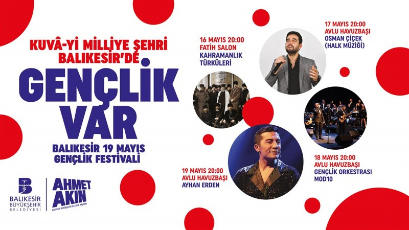 Büyükşehir Belediye Başkanı Ahmet Akın, ‘Balıkesir’de Gençlik Var’ sloganıyla 19 Mayıs Atatürk’ü Anma, Gençlik ve Spor Bayramı onuruna ‘Gençlik Festivali’ düzenliyor. 16-19 Mayıs günleri arasında devam edecek olan festivalin içeriği oldukça zengin. Dört gün boyunca sürecek olan festival, birbirinden eğlenceli organizasyonlara ev sahipliği yapacak. Gençlik Festivali etkinlikleri kapsamında; Avlu’da konserler, Milli Kuvvetler Caddesi’nde de konser, atölye ve etkinlikler yer alacak.
